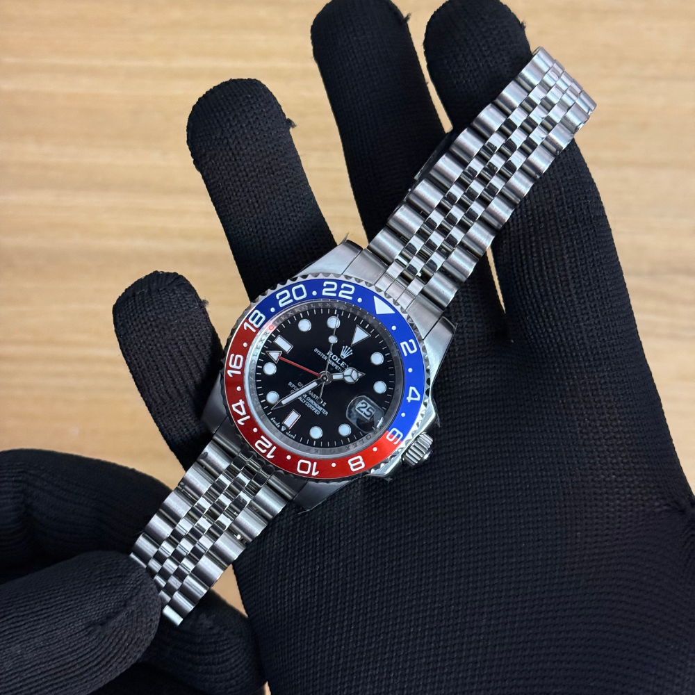 ارتقِ بإطلالتك مع ساعة Rolex GMT-Master II Pepsi الأيقونية، والتي تأتي بإطار ثنائي اللون أحمر وأزرق يرمز إلى الليل والنهار، وسوار جوبيلي الفاخر من الفولاذ المقاوم للصدأ. تم تصميم هذه الساعة خصيصًا لعشاق السفر حول العالم