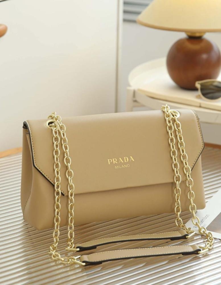 حقيبة Prada Milano بخامة الجلد الفاخرة باللون البيج بتصميم أنيق وصغير يلائم الإطلالات المسائية، تجمع بين الفخامة والعملية في قطعة واحدة مميزة