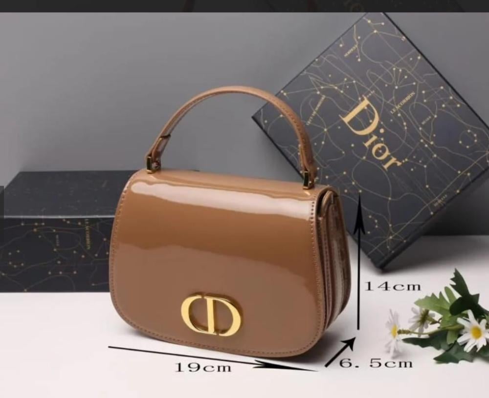 حقيبة Christian Diorبخامة الجلد الفاخرة باللون البني الفاتح اللامع وحزام بتصميم أنيق وصغير يلائم الإطلالات المسائية، تجمع بين الفخامة والعملية في قطعة واحدة مميزة